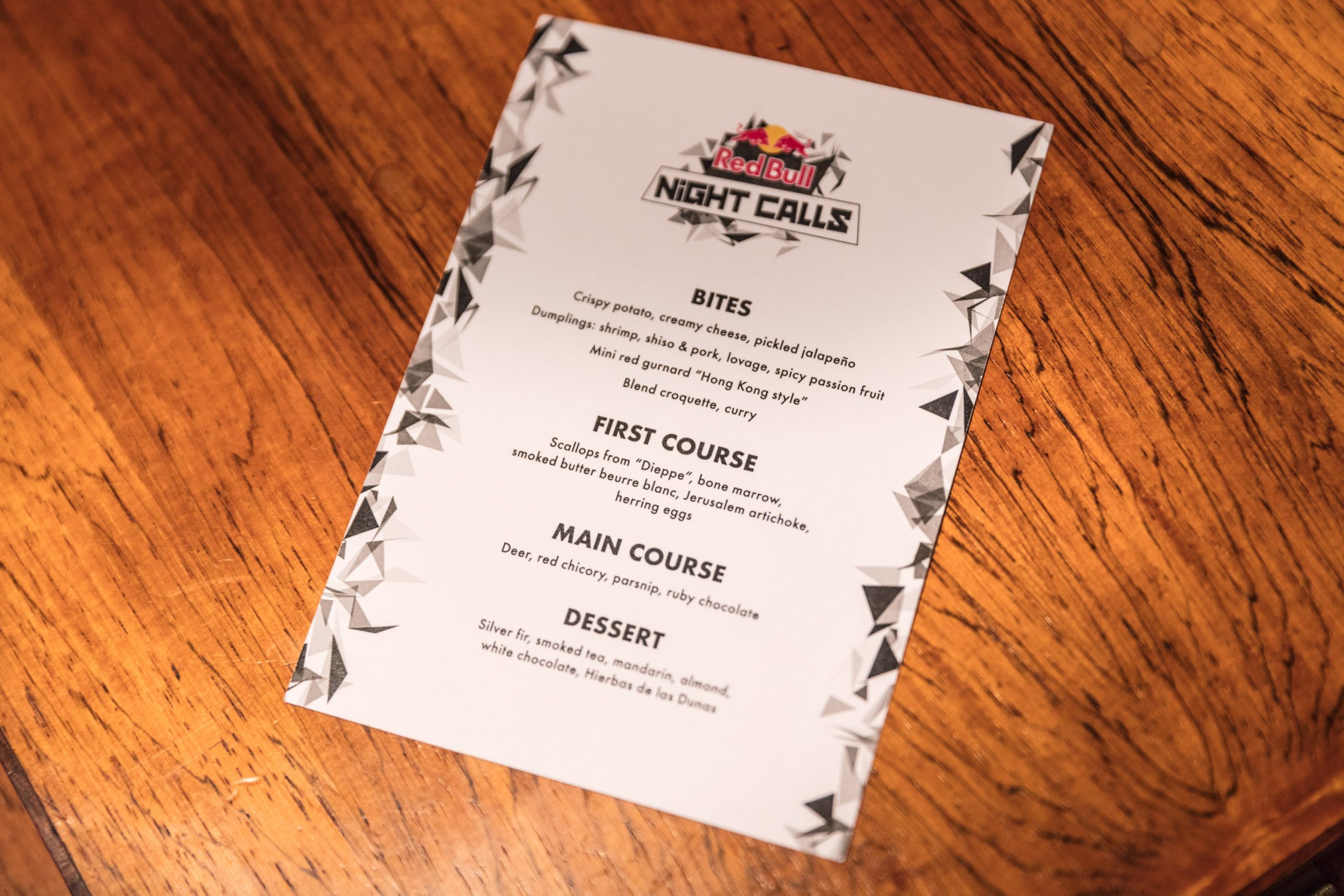 For Red Bull’s guests – Belgian nightlife club-owners and festival-organisers – we created a four-course tasting-menu.  We served a combination of scallops from “Dieppe’ with Jerusalem artichokes and bone-marrow and created a course with deer, red chicory, parsnip and Ruby chocolate.